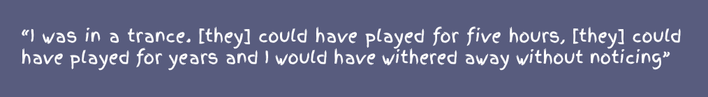 “I was in a trance, [Eva] could have played for five hours, [she] could have played for years and I would have withered away without noticing.”