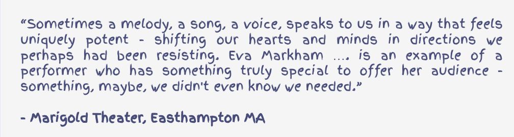 A seasoned spell-caster, Eva will capture your heart, slow your breath, and hold time still, quivering. “Eva Markham … is an example of a performer who has something truly special to offer her audience - something, maybe, we didn't even know we needed.” - Marigold Theater.